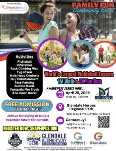 Shape Up Us has partnered with the City of Glendale, the Glendale School District, the Glendale Police Department, a Member of the Glendale Chamber, and Monster Athletes Juniors for this exciting event for all ages. World’s Largest Pickleball Lesson, Skateboard lessons, Obstacle inflatable, Bounce House, Basketball, Football, and Baseball inflatables, DJ, Hula Hoop Contests, Tug of War, and 30 vendor booths with activities and give-a-ways